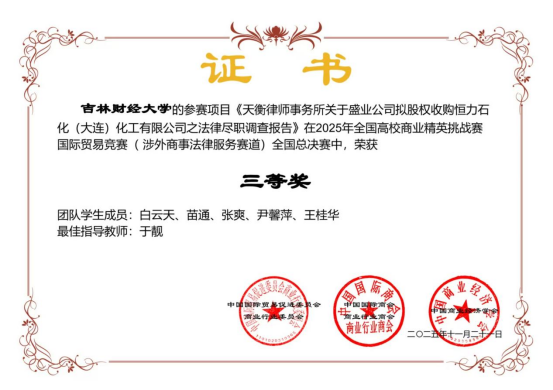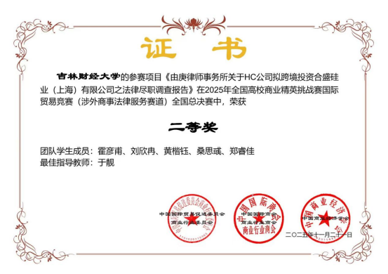 参赛作品包括《由庚律师事务所关于HC公司拟跨境投资合盛硅业(上海)有限公司之法律尽职调查报告》和《天衡律师事务所关于盛业公司拟股权收购恒力石化(大连)化工有限公司之法律尽职调查报告》。在于靓老师的专业指导下,由本科生霍彦甫(队长)、刘欣冉、黄楷钰、桑思彧、郑睿佳,以及研究生白云天(队长)、苗通、张爽、尹馨萍和王桂华所组成的团队,凭借扎实的专业知识和对涉外商事法律服务的深刻理解,协作完成了赛事任务,充分展现出安博·体育(中国)官方网站 学子优秀的专业水准和团队合作能力。此次成绩不仅体现了安博·体育(中国)官方网站 在高素质法律人才培养方面的成效,也是对学生在实务操作与创新思维方面能力的充分肯定。